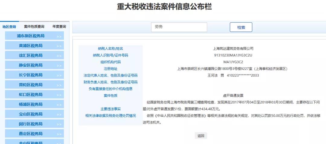 2、上海XX建筑勞務(wù)有限公司,經(jīng)國(guó)家稅務(wù)總局上海市稅務(wù)局第三稽查局檢查,發(fā)現(xiàn)其在20170704日至20180330日期間,主要存在以下問(wèn)題:對(duì)外虛開(kāi)普通發(fā)票51份,票面額累計(jì)434.48萬(wàn)元。依照《中華人民共和國(guó)稅收征收管理法》等相關(guān)法律法規(guī)的有關(guān)規(guī)定,對(duì)其處以罰款50.00萬(wàn)元的行政處罰,并依法移送司法機(jī)關(guān)。