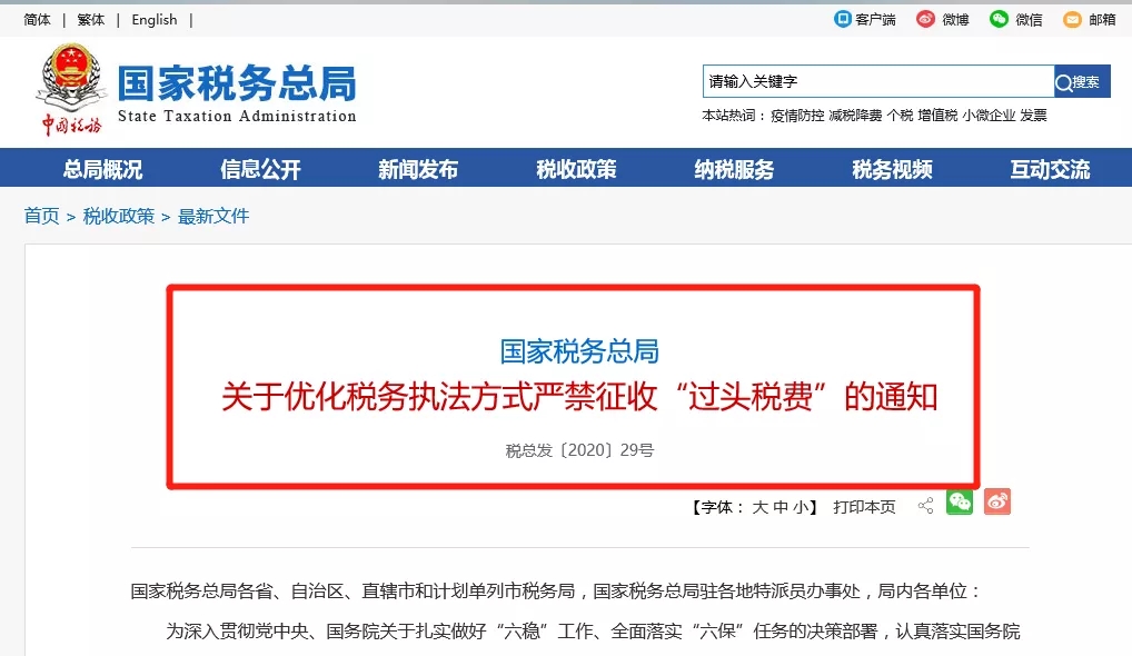 為深入貫徹黨中央、國務(wù)院關(guān)于扎實做好“六穩(wěn)”工作、全面落實“六保”任務(wù)的決策部署,認(rèn)真落實國務(wù)院常務(wù)會議有關(guān)精神,進(jìn)一步提升政治站位,充分發(fā)揮稅收職能作用,統(tǒng)籌推進(jìn)疫情防控和支持經(jīng)濟(jì)社會發(fā)展,現(xiàn)就優(yōu)化稅務(wù)執(zhí)法方式、嚴(yán)禁征收“過頭稅費”有關(guān)要求進(jìn)一步強(qiáng)調(diào)如下: