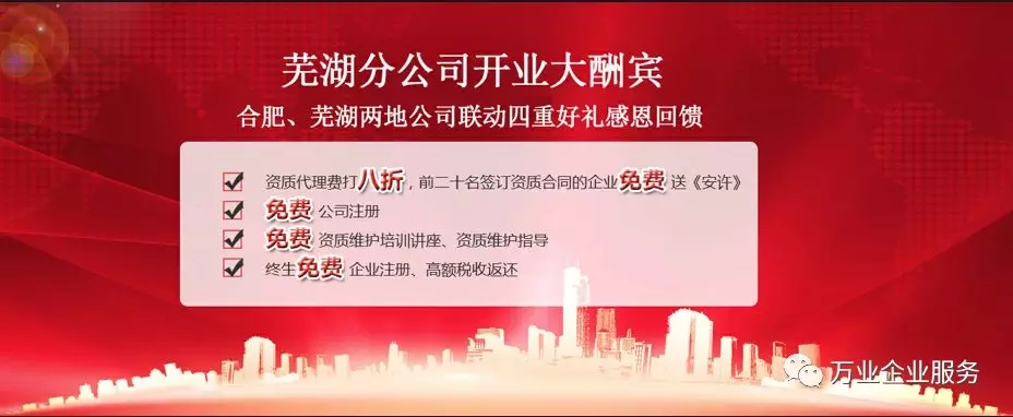 免費(fèi)福利 1 資質(zhì)代理費(fèi)打八折,前二十名簽訂資質(zhì)合同的企業(yè)免費(fèi)送《安許》 2 免費(fèi)公司注冊 3 免費(fèi)資質(zhì)維護(hù)培訓(xùn)講座、資質(zhì)維護(hù)指導(dǎo) 4 終生免費(fèi)企業(yè)注冊、高額稅收返還 說了這么多,快跟隨小編一睹新公司的風(fēng)采吧! 開分公司對于我們來說是挑戰(zhàn)也是機(jī)遇,挑戰(zhàn)在于外部環(huán)境,機(jī)遇在于面對挑戰(zhàn)我們?nèi)匀荒軌蚩焖偬幚聿⑶也粩嘧晕覂?yōu)化?,F(xiàn)分公司需要做的就是充分發(fā)揮我們的優(yōu)勢,希望在這座城市里能夠做出更好的成績來回饋大家。謝謝大家長期以來的支持,安徽萬業(yè)才能更好的成長為大家提供更優(yōu)質(zhì)的服務(wù)!我們相信,蕪湖分公司這艘滿載著希望的巨輪,定能乘風(fēng)破浪到達(dá)成功的彼岸!